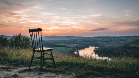 A solitary black wooden chair stands on grassy terrain, offering a breathtaking view of the sunset over a tranquil river and rolling hills.