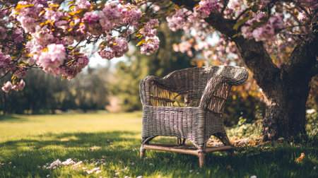 A cozy wicker chair sits peacefully under a blooming cherry blossom tree, surrounded by lush green grass, creating a perfect spot for relaxation in the spring.