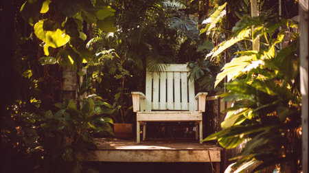 Discover a tranquil retreat with a charming white wooden chair nestled amid lush tropical foliage, perfect for relaxation or a peaceful escape in nature's beauty.