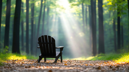 An inviting chair sits in a sunlit forest, inviting peace and contemplation. The image captures the beauty of nature and the allure of a quiet moment.