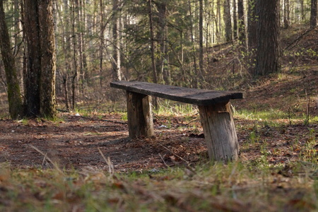 old furniture in the forest, a playground for relaxing in the forest, a wooden chair in a forest clearing, tranquility and privacy, a sunny day