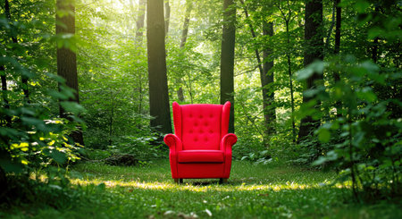Unusual Red Armchair Placed in a Lush Forest Setting