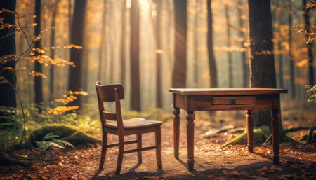 Wooden table and chairs in the autumn forest. Soft focus.