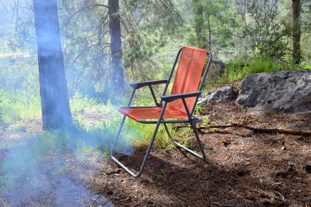 empty camping chair for Outdoor Camping in forest. Tourism, outdoors recreation, active style of life
