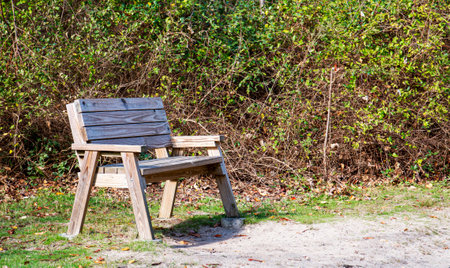 Wooden bench on the side of a walking trail in Gardiners Park Bay Shore Long Island with copy space on the right side.