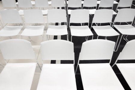Conference chairs in business room, rows of white plastic comfortable seats in empty corporate presentation meeting office, detail, selective focus