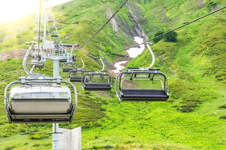 Cable car path in the mountains on the slope of the peak in the summer with green grass