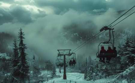 A ski lift ascends high into a sky blanketed with thick clouds, creating a surreal and unique scene, A ski lift ascending into the clouds
