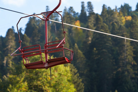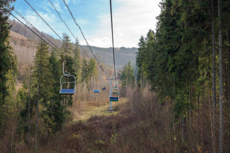 Skole, Ukraine - 03 November 2018: Old ski lifts ride through pine forest