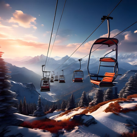 Skiers enjoy a scenic ascent on a gondola lift surrounded by towering snow-covered mountains and serene winter landscapes. The atmosphere is peaceful and inviting.