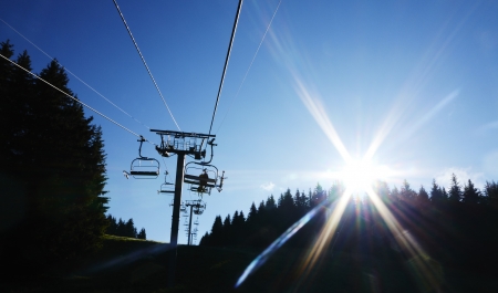 Chair lift at a ski resort in the mountains in the summer at sunset