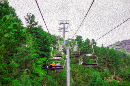 Ski lift on the slop in mountain ski resort with skiers on the lift. Cableway for tourists, skiers and snowboarders. active rest in the mountains in winter. Special light green filter. High quality photo