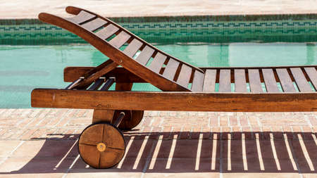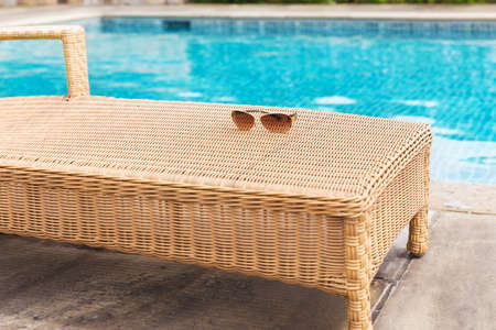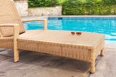 Empty chair deck lounge around swimming pool in hotel resort for travel vacation