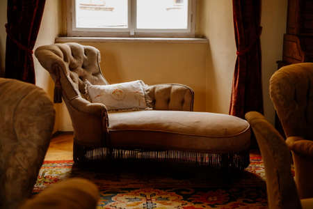 Libochovice, Bohemia, Czech Republic, 19 September 2021: Castle interior with baroque wooden furniture, soft chaise longue with high back on carpet by window, embroidered cushion