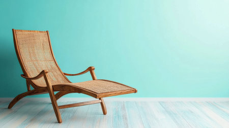 This image features an elegant wooden lounge chair positioned against a soft blue wall, creating a tranquil interior environment perfect for relaxation or leisure activities.