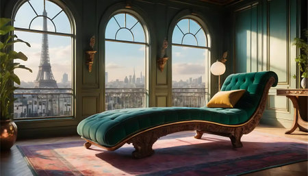 Vintage style chaise lounge is showcased in an opulent Parisian apartment with a stunning Eiffel Tower view; perfect for travel and interior design.