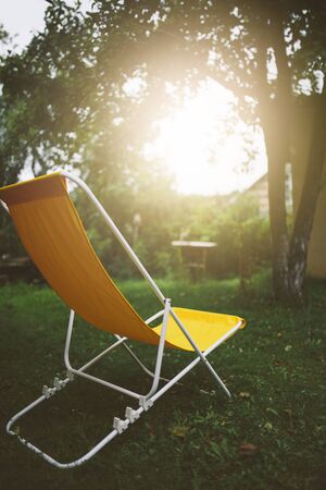 Empty yellow fabric chair in summer garden, resting and relaxing concept, nobody