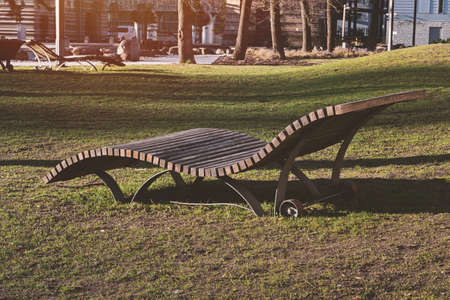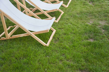 Part of a lightweight folding chair for outdoor recreation. An empty white wooden chaise longue on the green grass of a fresh lawn with a place to copy. High quality photo