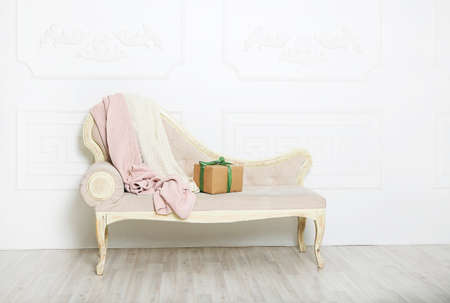 Luxurious chaise lounge with velvet throw and decorative cushion in elegant interior design