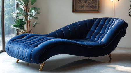 Photographer Chen Man's fashionable photography style features a dark blue velvet sofa, curved lines, and gold accents; the picture is full of light, luxury, and modern elements, exuding a sense of design and elegance. In the living room, the dawn shines from an oblique angle on the wall, creating soft lighting. The clean background creates high-definition images full of a luxurious and designed atmosphere. The white walls and white floors add a touch of warmth to the overall scene. --chaos 30 --ar 16:9 --stylize 750 --v 6.1 Job ID: dab5a30c-cec2-4d42-984e-3499cfaaef18