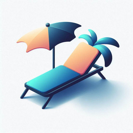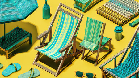 Vibrant, stylized image of miniature beach furniture, including chairs, an umbrella, and accessories, arranged on a bright yellow background. The furniture is crafted with a stylized, almost isometric approach, featuring a bright turquoise and green striped pattern.