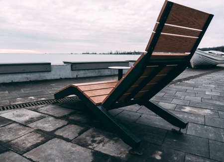 empty sun lounger on the seashore on a cloudy evening at sunset