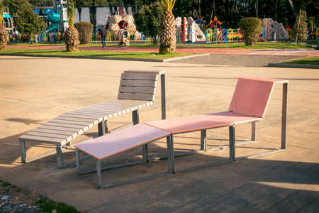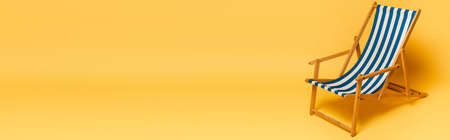 empty striped lawn chair in garden on grass against background of sunlight. Relax and chill.