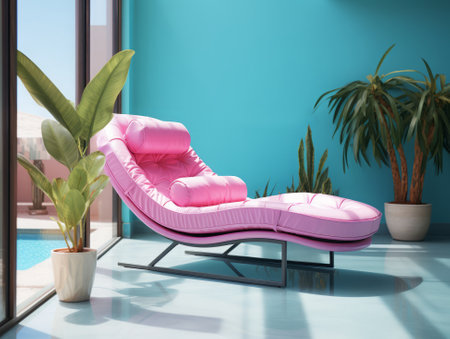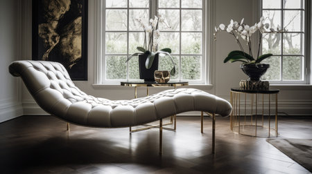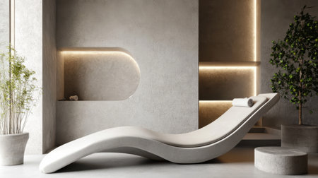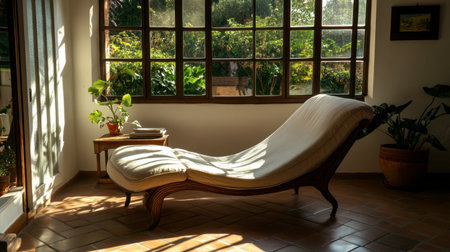 A tranquil indoor scene featuring an elegant chaise lounge, softly illuminated by sunlight, surrounded by vibrant greenery and inviting decor for relaxation and comfort.