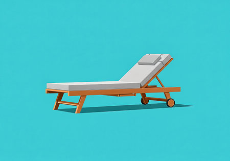 A modern flat design illustration of a wooden sun lounger with grey cushions and pillow, casting a sharp shadow on a vibrant turquoise background. Ideal for summer, vacation, and leisure themes.
