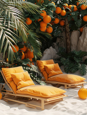Sunbathing lounge chairs arranged in flat lay style on vibrant yellow background, casting distinct shadows that enhance visual appeal. warm colors evoke relaxing atmosphere