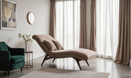 A sleek modern chaise lounge upholstered in soft mocha mousse velvet, placed near a large window with light filtering through sheer white curtains.