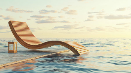Wooden chaise lounge, positioned over tranquil water, with a serene seascape and sunrise backdrop. A small wooden lantern is placed on the stone surface beside the lounge.