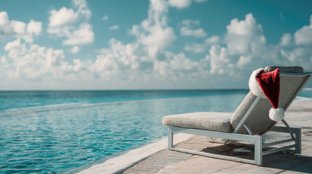 A serene poolside scene featuring a lounge chair draped with a Santa hat, set against a bright blue sky and calm ocean waters, perfect for a holiday getaway.