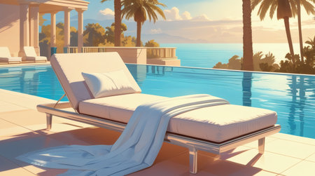 Swimming pool on the hotel grounds and a sunbed near it. Sunrise, a picture in light colors. Generated by AI.
