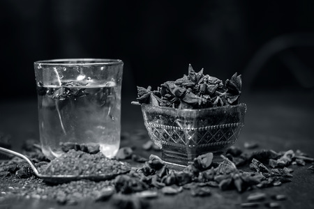 Water of star anise,Chakraphool,Illicium verum and its powder on wooden surface.