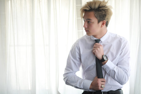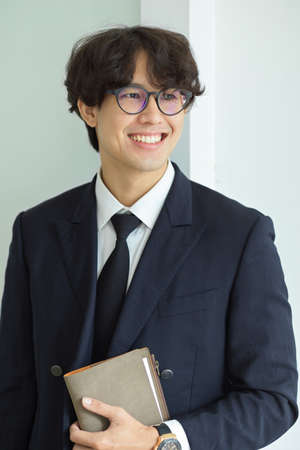 Portrait of Happy mood asian young businessman puts on cufflinks wear a business suit of man in black jacket and white shirt in white wall office background,Men's style shirt and cuffs.