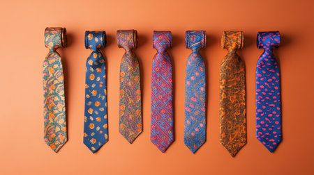 A stunning display of colorful ties featuring unique designs and patterns, set against an orange background to emphasize their vibrant aesthetics.