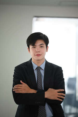 Portrait of happy successful businessman with eye-glasses wearing in a formal suit in the office.