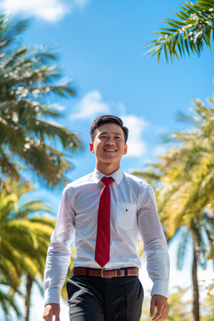A man exudes sophistication in a crisp white shirt and bold red tie.