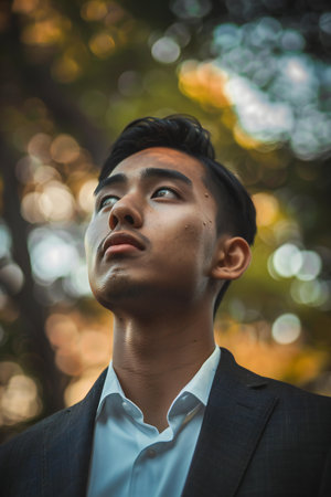 Asian Male Harmonic Convergence Asian man, 45s, unifying attire, bringing diverse elements into resonance, peaceful expression, .
