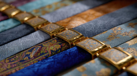 This image showcases a beautiful array of colorful satin ribbons adorned with intricate patterns and golden embellishments, perfect for creative projects.