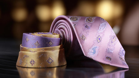 A close-up view of elegant pink and gold silk ties beautifully arranged on a polished surface, showcasing intricate patterns and luxurious textures.