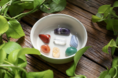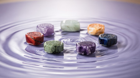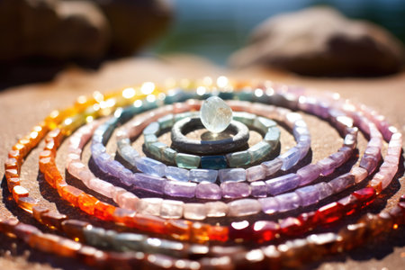 soft-focus image of chakra stones arranged in a spiral, created with generative ai