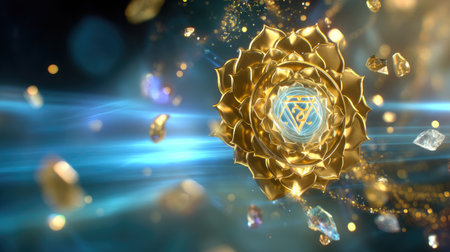 This stunning image showcases a golden flower mandala surrounded by radiant light rays and sparkling crystals, evoking a sense of peace and harmony.