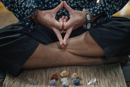 Crystals, energy stones for meditation over sunset background, inner peace, chakra cleansing and balance concept..