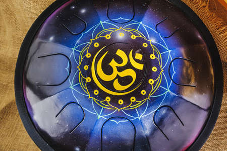colors steel Tongue Drum, Vadjraghanta, Tank Drum for Sound Waves Therapy and Meditation, Healing. Close-up modern musical instrument Hand pan or metal tongue drumon highly artistic product