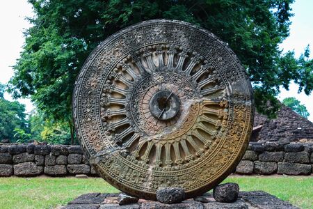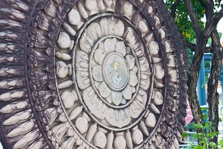 Carved stone Dhammajak at Buddhamonthon in Bangkok, Thailand