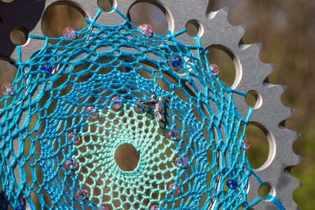 Mint cream dream catcher on turquoise textured background. Texture of concrete.