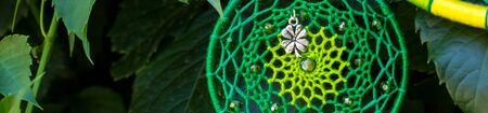 Banner of Dream catcher with feathers threads and beads rope hanging. Dreamcatcher handmade