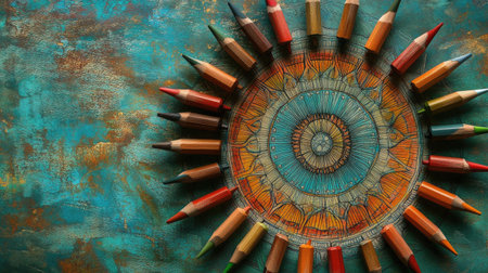 A stunning arrangement of colorful pencils forms a circular shape on a rustic wooden table, showcasing a vibrant display that inspires creativity and artistic expression.